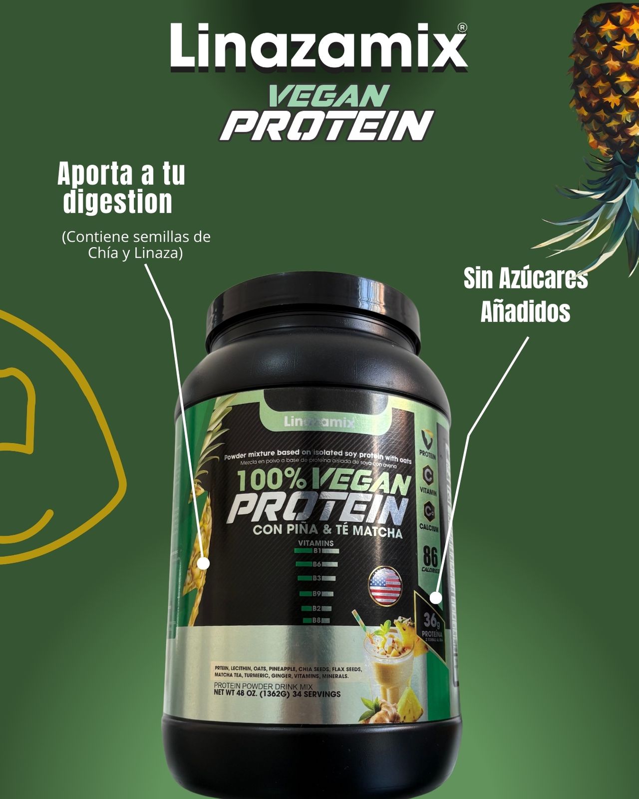 ✔️Proteína, lecitina, Avena, semillas de chia, semillas de linaza, Te de Matcha, Curcuma, Jengibre, Vitaminas y Minerales.